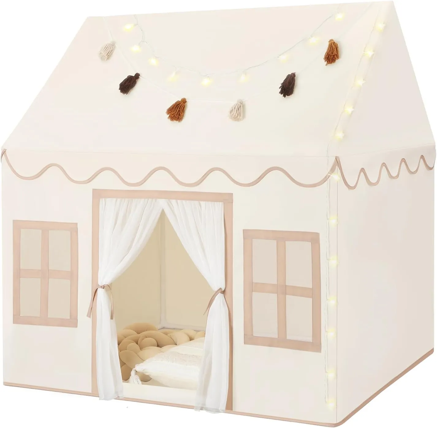 The cottage-style play tent is the room's anchor. Pitched-roof play structures read as architecture rather than toy, creating a "room within a room" that gives kids a defined retreat without hauling in a piece of furniture. Pair it with bunting and fairy lights for the storybook feel, then keep the surrounding decor stripped back so the tent stays the hero.